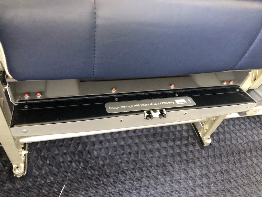 Immerhin ist der kleine Tisch am Mittelplatz geblieben, der bei einigen Gesellschaften inzwischen abgeschafft wurde. Dieser wird je nach Größe der Business Class installiert und kann auch wieder entfernt werden. Dies kann auf längeren Flügen interessant sein wenn man die ganze Reihe für sich hat. Der Tisch wird dann einfach in ein Fach unter dem Platz verstaut.