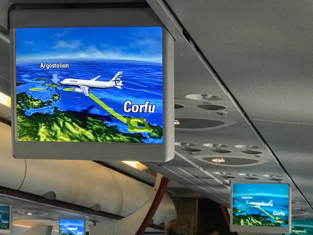 Ansonsten können natürlich jederzeit während des Fluges auch noch Getränke bei der Crew bestellt werden. Hier habe ich die Mitarbeiter von Aegean bisher stets als sehr gastfreundlich erlebt. Ein Inflight-Entertainment-System gibt es in dem Sinne nicht. Über die Deckenmonitore werden entweder griechische Sehenswürdigkeiten und Reisetipps präsentiert, oder die Fluggäste können den Flugverlauf etwas verfolgen.