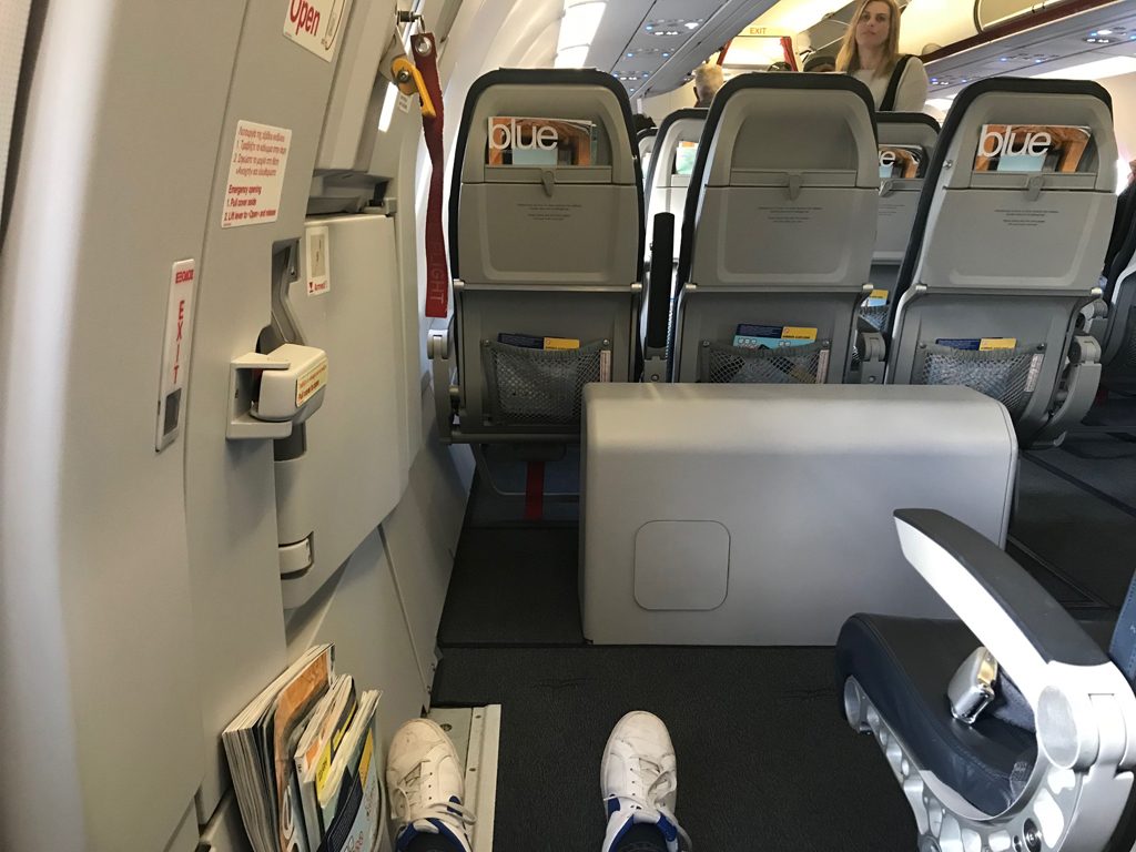 Zwei der drei Flüge verbrachte ich am Notausgang. Im A320 ist dieser an den Sitzreihen 11 und 12 platziert. Im A321 gibt es, wie auf der Seatmap ersichtlich, drei Notausgangsreihen. Ich wählte für den Mittelstreckenflug von Thessaloniki nach Frankfurt (Main) den Platz 10A, der ein Maximum an Sitzabstand bietet und von dem man zudem aufstehen kann, ohne die Sitznachbarn zu behindern.