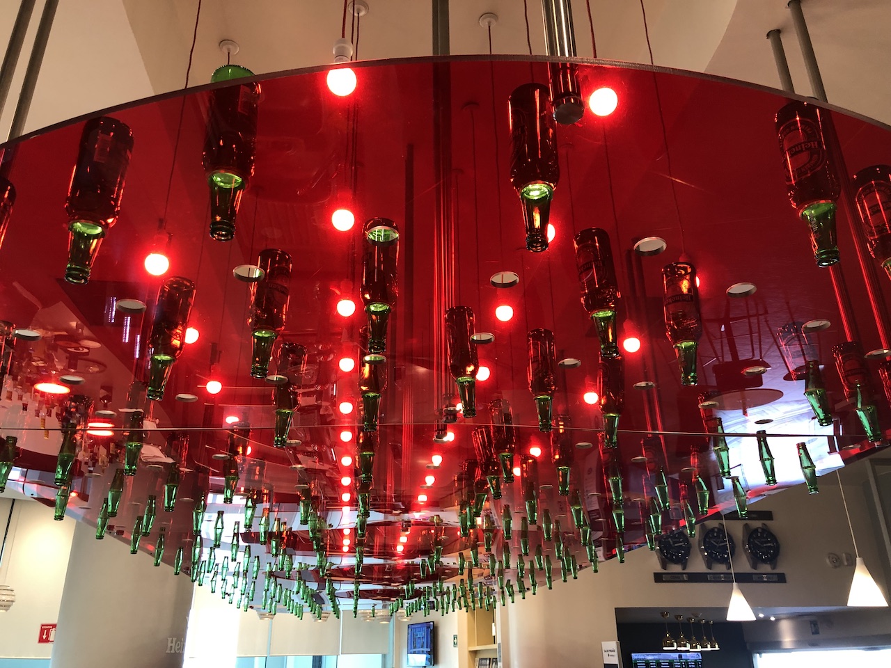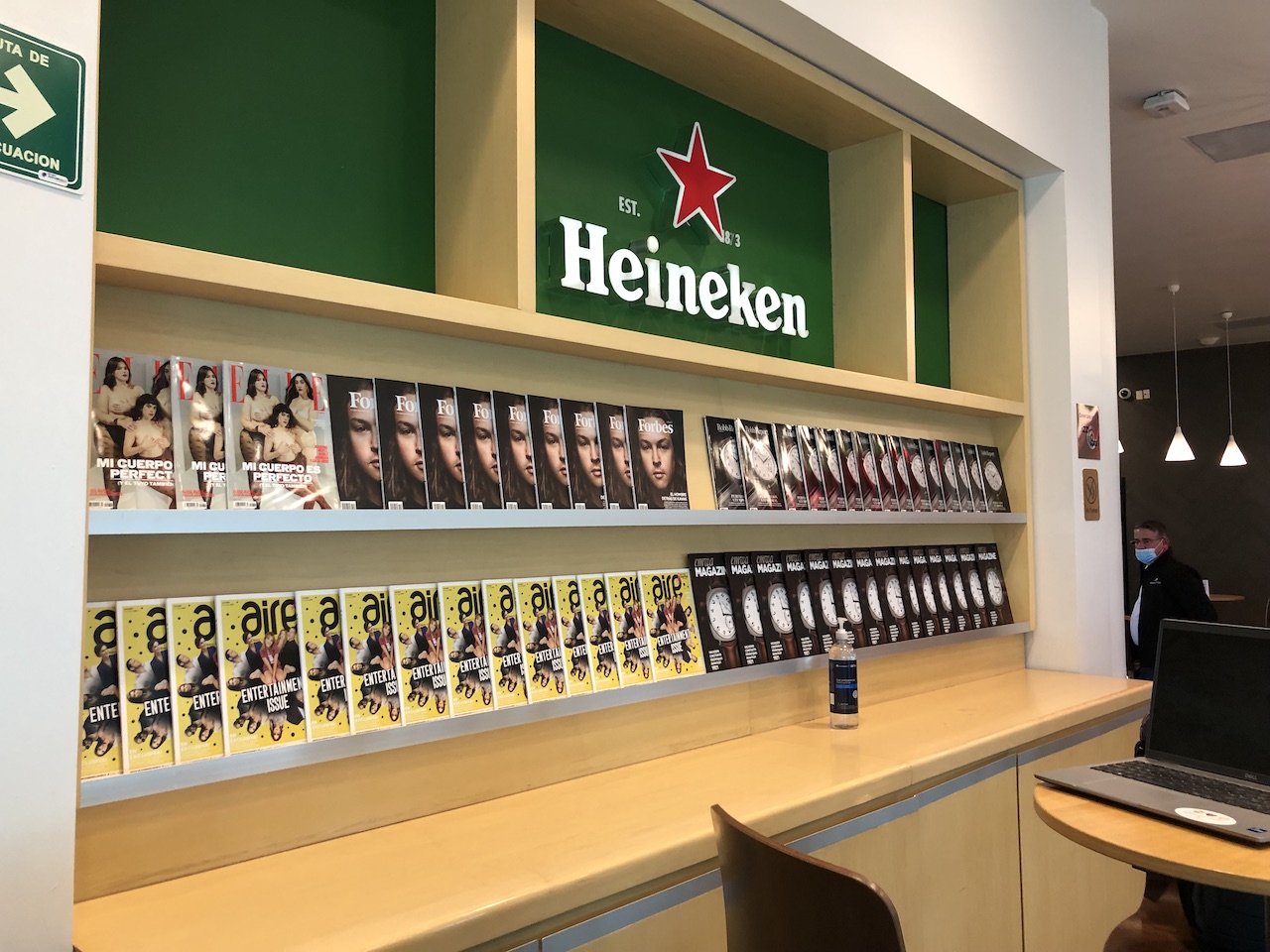 Ein kleines Sortiment an Zeitschriften liegt in einem Regal bereit, in der Terraza erhalten Besucher einen Flaschenkühler vom Sponsor Heineken.