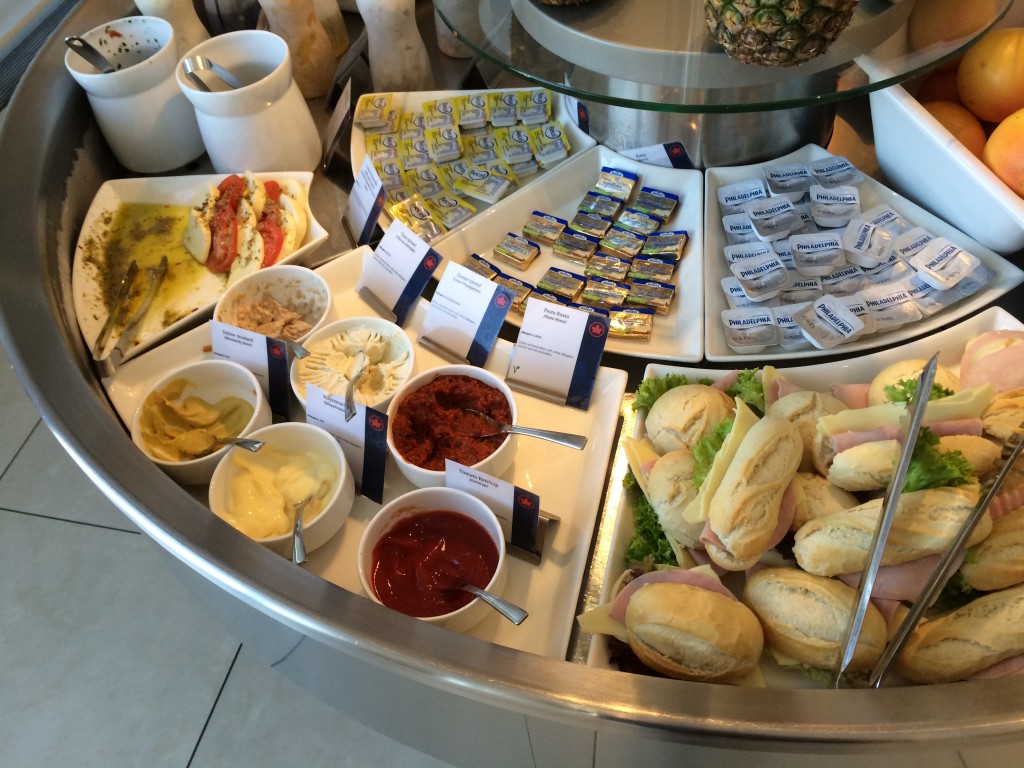 Der Buffetbereich mit den Speisen hatte, insbesondere für eine Business Lounge einiges zu bieten. Es gab eine Insel mit Salaten, Obst, Sandwiches und Dips.