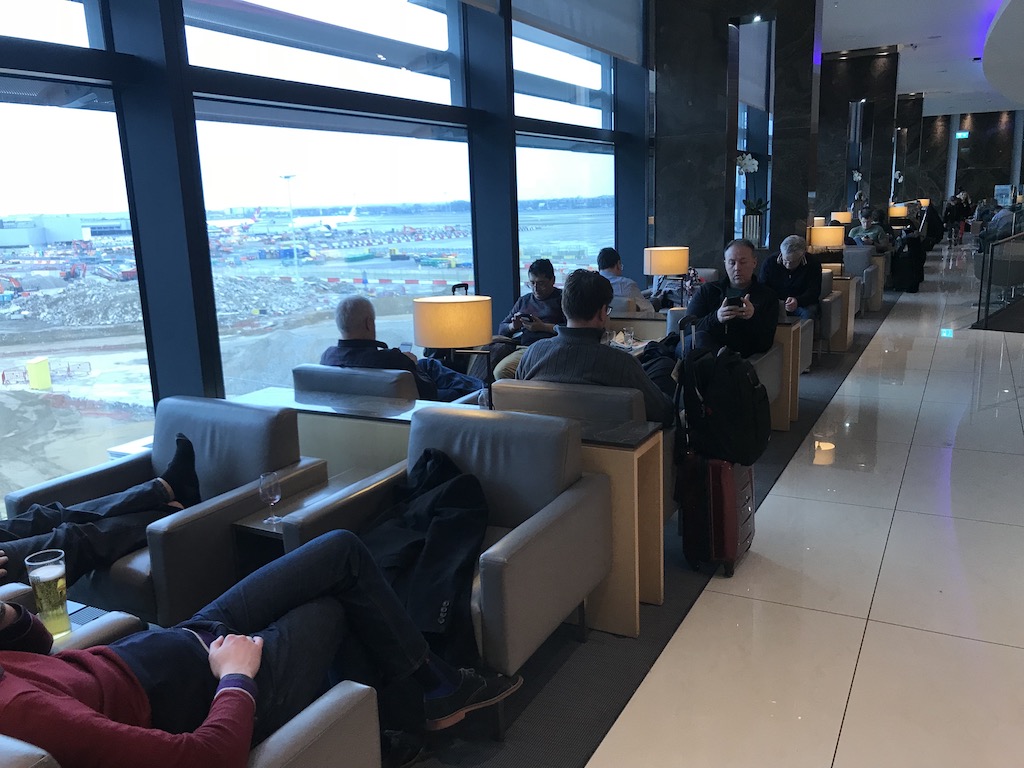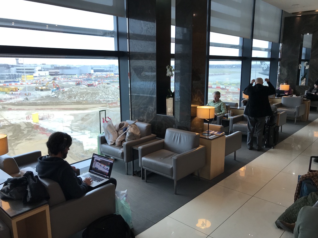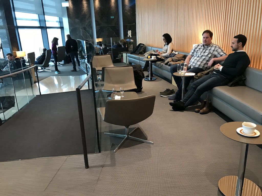 Die Lounge ist sehr modern und offen gestaltet und bietet viele verschiedene Sitzmöglichkeiten. Unter anderem gibt es verschiedene Bereiche mit Tischen zum Essen und/oder Arbeiten. Dabei sind viele Sitzplätze an der großen Fensterfront in Richtung des sich derzeit im Umbau befindlichen Vorfeldes vor Terminal 2 angelegt. Dadurch wirkt die Lounge sehr gut natürlich ausgeleuchtet.
