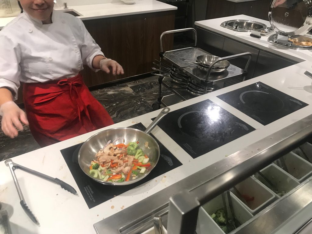 Highlight des Essbereichs war jedoch die Live-Cooking-Station, bei der eine Mitarbeiterin frische (Brat-)Nudelgerichte individuell für die Gäste frisch zubereitete.