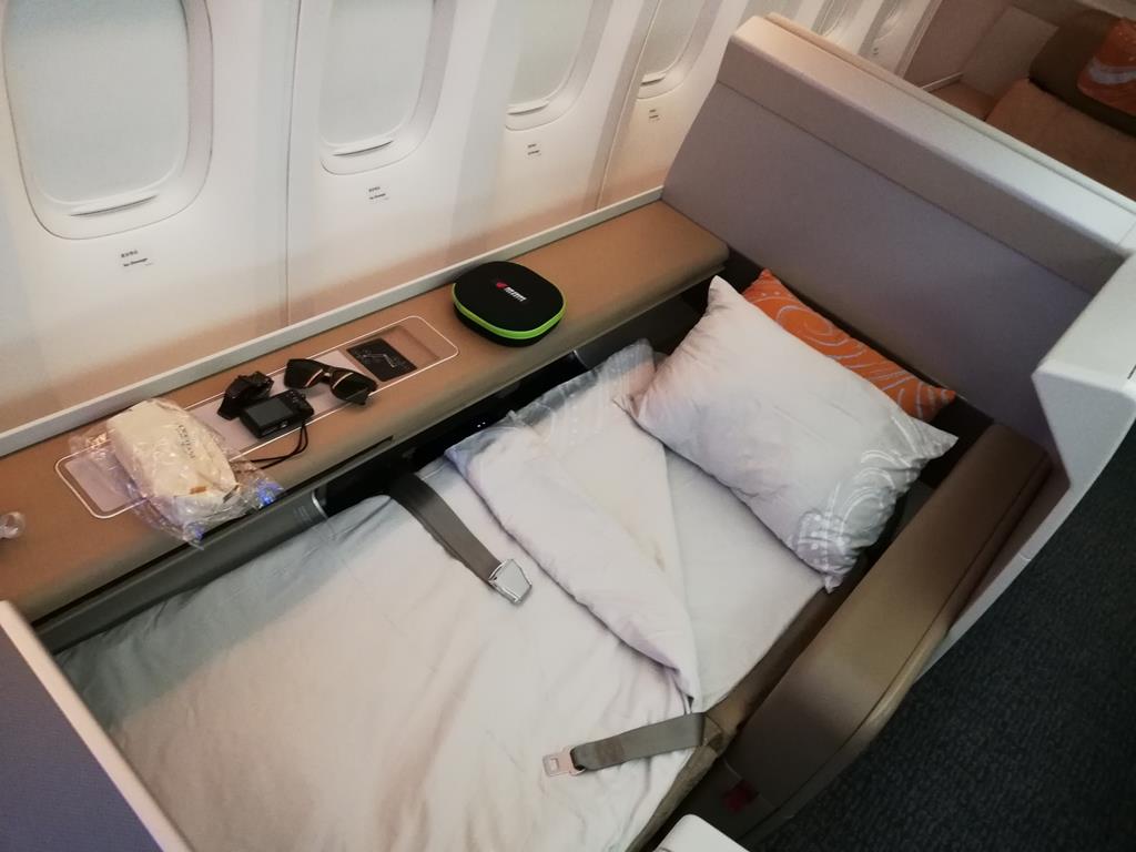 Nach dem Essen ließen wir uns das Bett machen. Hier gab es leider keine Matratze. Es wurde eine Bettdecke als Unterlage auf den Sitz gelegt. Die Kissen und Decken waren sehr bequem. Natürlich wurden auch Pyjamas verteilt.