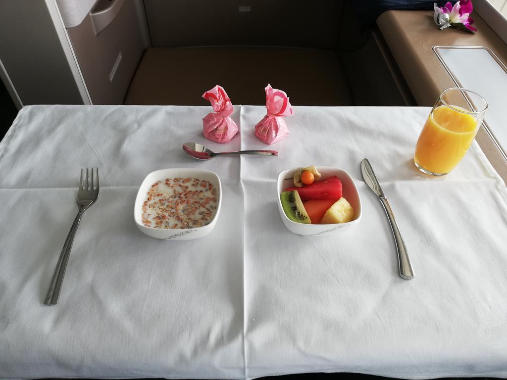 Ich selbst bin nach guten sechs Stunden, etwa 40 Minuten vor der Landung aufgewacht. Der Schlaf war aufgrund von Turbulenzen etwas unruhig. Zudem war es mal zu warm und mal zu kalt in der Kabine, beziehungsweise unter der Decke. Direkt war eine der netten Flugbegleiterin zur Stelle und bat mir an das Frühstück zu servieren. Neben eine Cappuccino (Nescafe) gab es ein Müsli und ein paar Früchte. Nach dem Abendessen, war ich nicht wirklich hungrig.