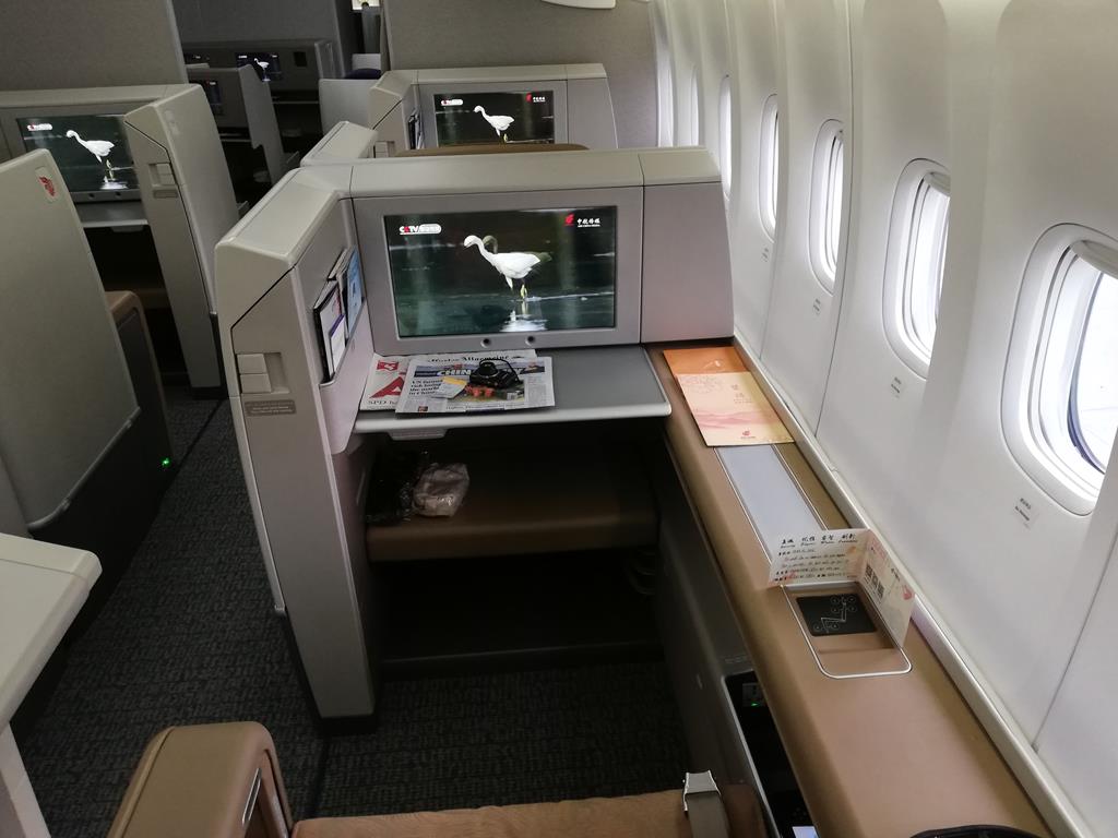 Die Business Class befindet sich in der Nase der Boeing 747-8, auch hinter der Galley befinden sich noch zwei Reihen mit sechs Sitzen. Auch im gesamten Oberdeck der Air China Boeing 747-8 ist eine Business Class in 2-2 Anordnung verbaut. Insgesamt gibt es 54 Sitze, die sich alle in ein flaches Bett verwandeln lassen. Der Sitz lässt sich mit United oder auch dem der Lufthansa vergleichen.