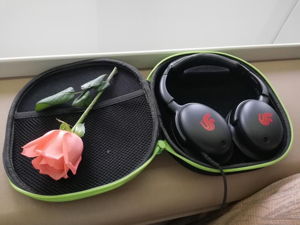 Der Kopfhörer lag bereits am Platz, inklusiv einer Rose, mit der die Hülle verziert wurde. Ein ungewöhnlicher Platz. Vom Tragekomfort waren die Kopfhörer durchaus bequem.