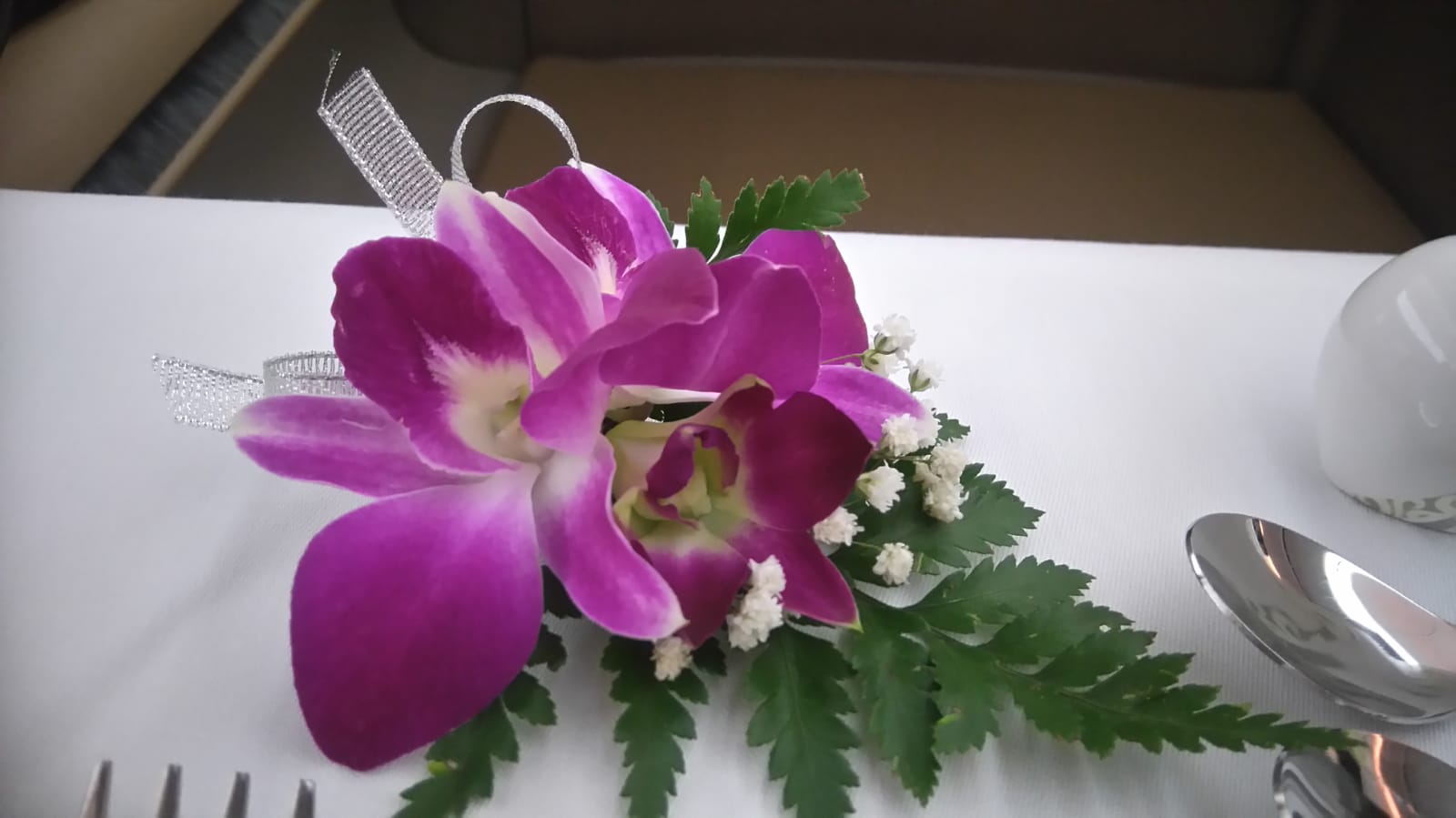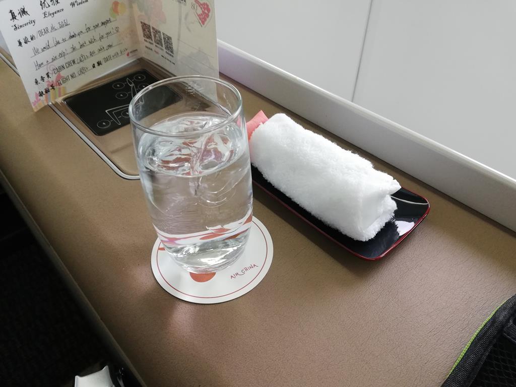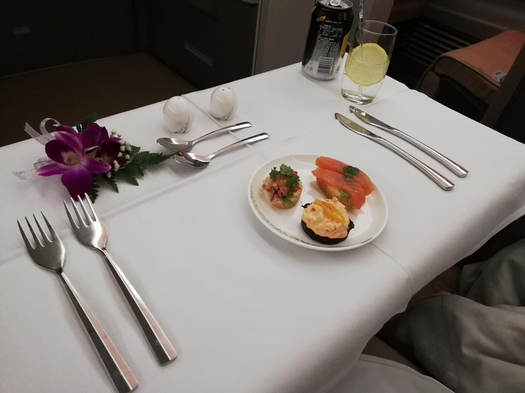 Direkt beim Einstigen wurden wir persönlich begrüßt und zu unserem Platz geführt. Anschließend stellte sich die freundliche Crew vor und bot uns Getränke an. Neben einem Glas Champagner bestellte ich mir noch ein Glas Wasser. Eine persönliche Wilkommenskarte wartete auch schon am Platz. Ein schöner Touch.
