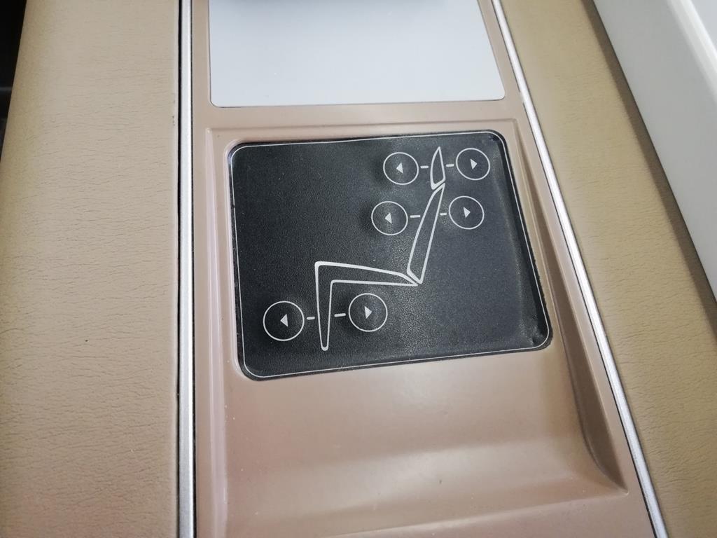 Die Air China First Class in der Boeing 747-8 Sitz ist mit einem hellbraunen Stoff bezogen und dabei recht bequem, wenn auch von der etwas härteren Seite. Unter der linken Armlehne befindet sich ein Staufach mit einer Flasche Wasser, auf anderen Seite ein kleineres Fach mit dem Controller für das Inflight Entertainment, einer Steckdose, sowie zwei USB Anschlüssen.