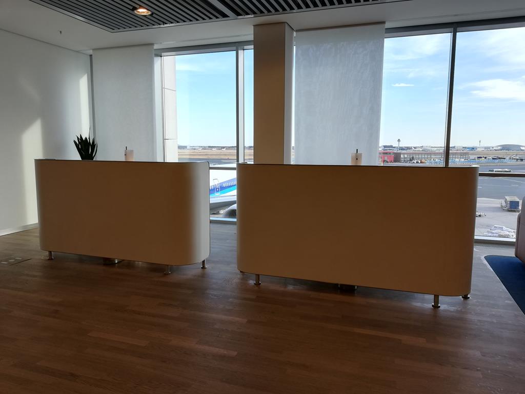 Die 12 Sitze sind als halb offene Suiten gestaltet. Das heißt um den Sitz ist eine Trennwand zum Gang, die in etwa brusthoch ist.