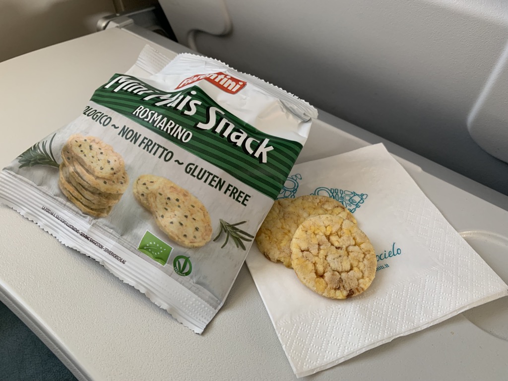 Bei Flugzeiten von etwa einer Stunde bietet Air Dolomiti in der Economy Class natürlich kein volles Essen an, sondern man bietet einen kleinen abgepackten Snack. In meinen Fall waren es Maiskekse mit Rosmarin, welche für die kurze Flugzeit absolut adäquat waren.