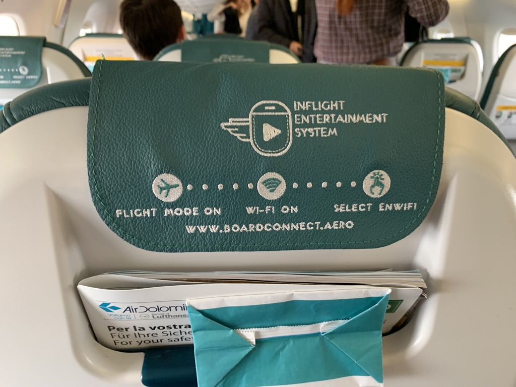Neben dem Tisch befindet sich in der Rückenlehne auch noch die Literaturtasche und ein Hinweis auf das Entertainmentsystem über WIFI bei Air Dolomiti.