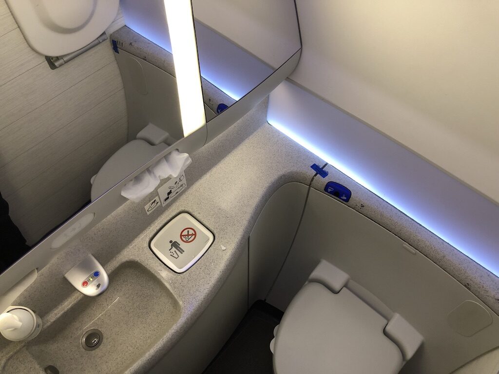 Aus dem Cockpit gab es noch einige Hinweise zum heutigen Routing und dem Wetter in Madrid. Die Crew sammelte in der Kabine den letzten Müll ein und schon ging es in den Sinkflug. Ich nutzte noch schnell die Gelegenheit um in einen Waschraum zu schauen, dieser war wie die restliche Kabine in einem sauberen und ordentlichen Zustand.