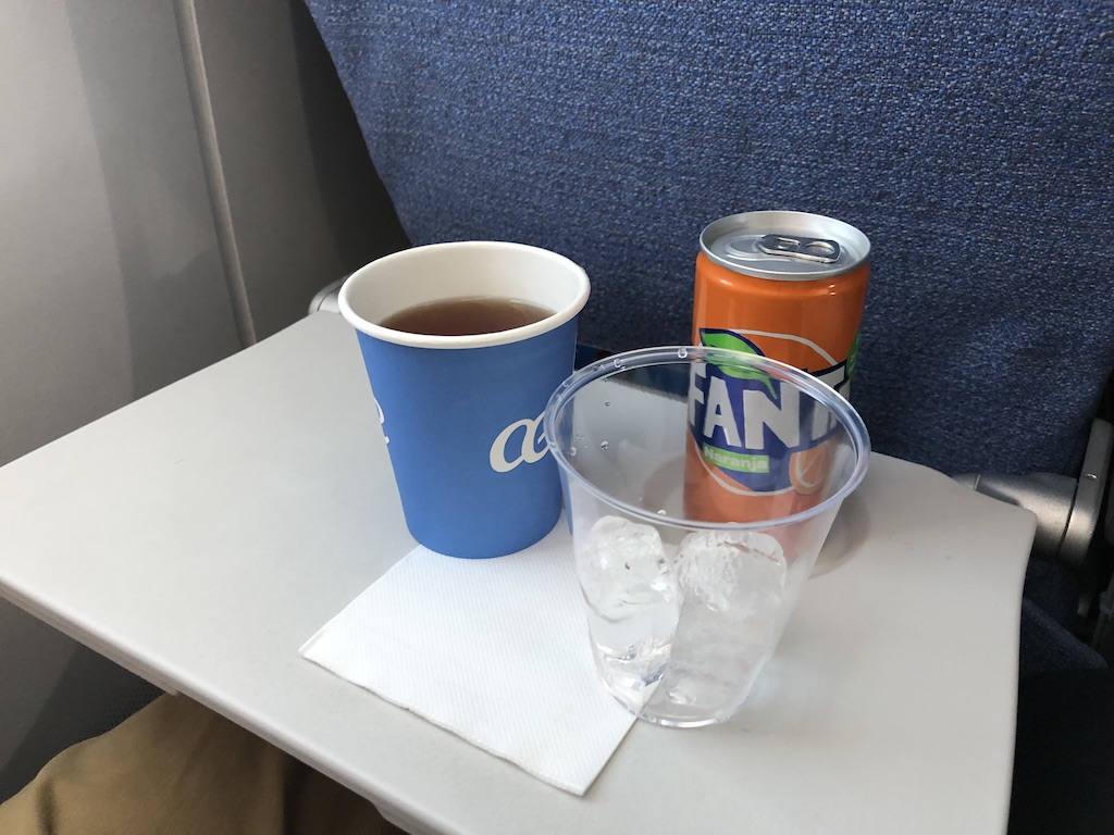 Die Crew war zügig mit den Trolleys in der Kabine unterwegs. Eine Menükarte ist auch auf der Website der Gesellschaft verfügbar, dort stand allerdings noch der Hinweis dass der Service wegen der Pandemie aktuell gar nicht durchgeführt wird- eine veraltete Information.