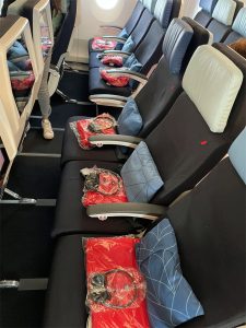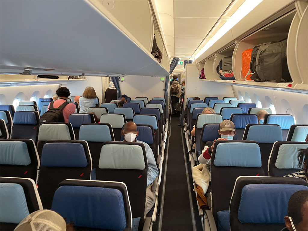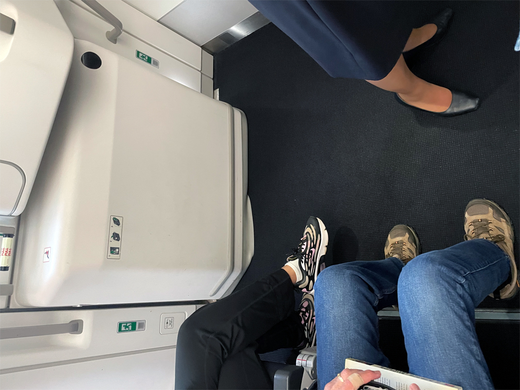 Beim letzten Blick in die App war der Platz neben meinem noch frei und im Mittelblock waren sogar noch zwei Sitze frei. Das lag gar nicht einmal daran, dass das Flugzeug nur wenige Passagiere hatte, sondern eher daran, dass alle unbedingt vorne sitzen wollten. So gab es hinten in der Economy Class dann ein paar freie Plätze.