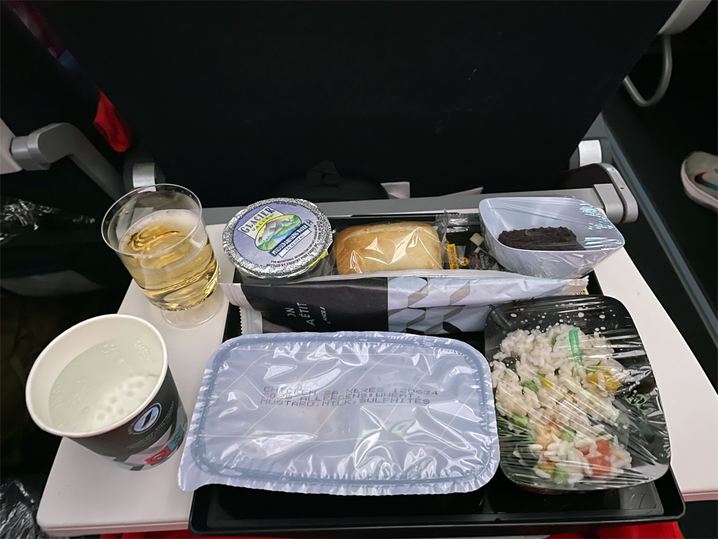 Der erste Service begann ca. 45 Minuten nach dem Start in Atlanta. Es gab ein warmes Abendessen, wobei die Wahl zwischen einem Gericht mit Fleisch und einer vegetarischen Mahlzeit bestand. Ich entschied mich für das Hühnchen. Das genoss ich mit einem (Plastik-)Glas Champagner und einem (Papp-)becher Perrier. Das Essen war wirklich lecker, da gibt es in der Economy Class oft Schlechteres.