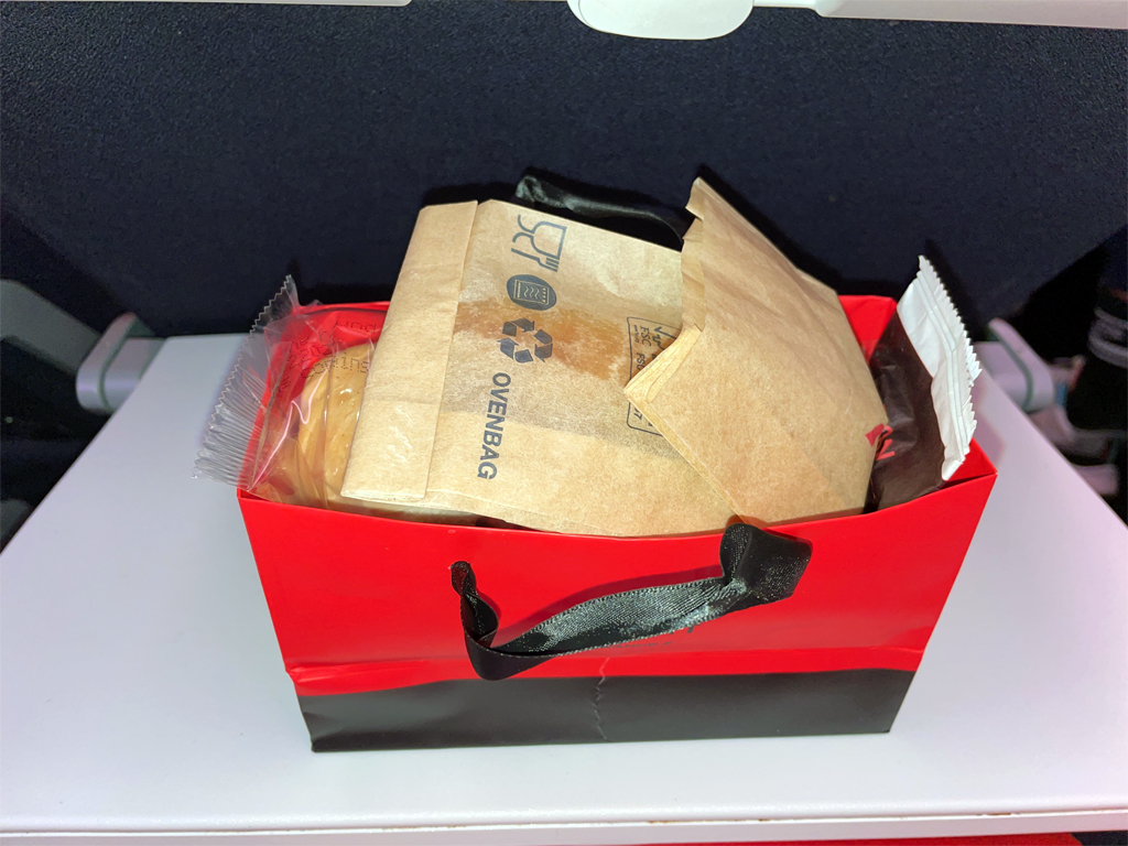 Ungefähr eine Stunde vor der Landung gab es dann ein kleines Frühstück, das in einer Papiertüte ausgereicht wurde. Neben dem Inhalt konnte man noch Tee oder Kaffee sowie Kaltgetränke bestellen. Das Frühstück war knapp bemessen, aber qualitativ solide.