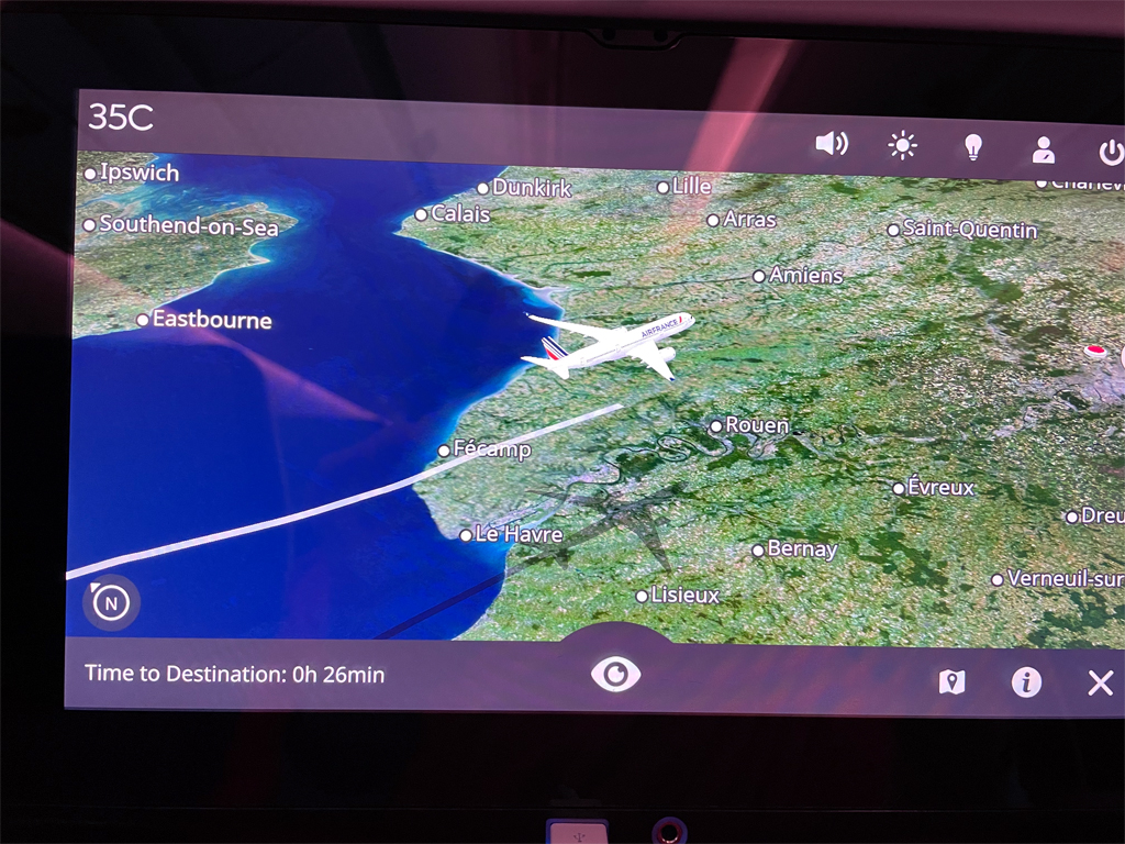 Das Entertainment System ist neu und mit den 11,7 Zoll berührungsempfindlichen Bildschirmen angenehm groß. Leider hat sich Air France für spiegelnde Monitore entschieden. Auf einem Nachtflug wie diesem sicherlich kein Problem, aber tagsüber kann das bei einer hellen Kabine ein Nachteil sein.