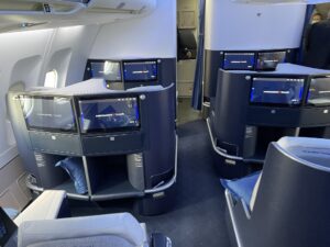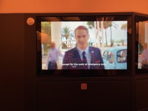 Durch das starke Spiegeln der Monitore verwandelt sich die Business Class in den Spiegelsaal von Schloss Versailles. Wenn man auf seinen Bildschirm guckt und dieser entweder ausgeschaltet ist oder ein dunkles Bild wiedergibt, sieht man – ohne es zu wollen – die Sitznachbarn. Bei mir waren es die Sitze A und C, auf die ich ungewollt gucken durfte. Mithilfe des Monitors zu meiner Rechten hatte ich sowohl meinen Nebenplatz als auch die Plätze K und L jederzeit im Blick. Und sie mich auch. Deshalb ist die ausfahrbare Trennwand zwischen den Sitzen eher dazu geeignet, direkten Sichtkontakt zu vermeiden, als die Privatsphäre tatsächlich zu erhöhen.
