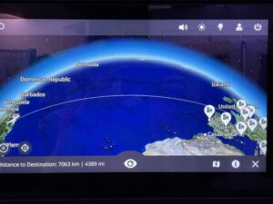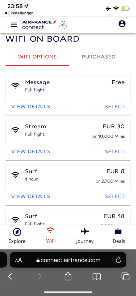 WiFi ist vorhanden. So kann man die Flugkarte entweder am Monitor (auch als Picture in Picture) oder am Smartphone verfolgen. Für die Kommunikation mit der Außenwelt gibt es gratis Bandbreite zur Nutzung von Messengern (für Textnachrichten). Wer mehr Bandbreite haben möchte, kann diese erwerben. Das Browsing Paket kostet 8 Euro, das Streamingpaket 30 Euro, wobei ich nicht beurteilen kann, ob man damit Filme oder sogar Livesendungen zufriedenstellend streamen kann.