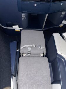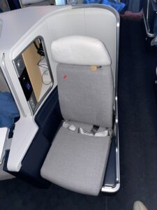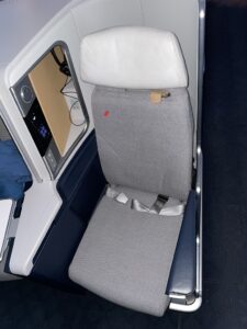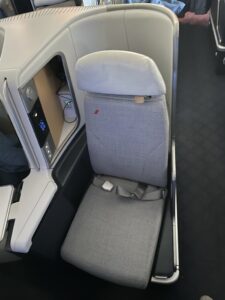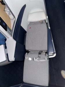 Der Business Class Sitz ähnelt stark dem Sitz bei Lufthansa, wobei Air France dem Sitz deutlich mehr „Drumherum“ spendiert, wodurch zum einen mehr Stauraum verfügbar wird, zum anderen die Privatsphäre ein wenig größer wird. Aber diese V-Stellung der Sitze mit dem grauen Sitzbezug, verleitet, Parallelen zu ziehen.