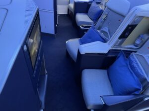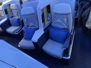 Zum Boardingzeitpunkt standen auf allen Plätzen der Business Class bereits blaue Kissen mit Volant, eingeschweißte Decken, ein Kleiderbügel sowie eine kleine Wasserflasche bereit. Die Kopfhörer waren ebenfalls bereits im Fach verstaut.