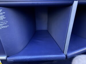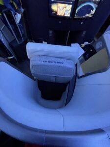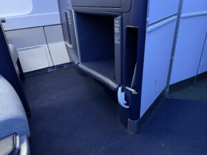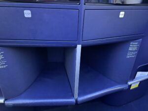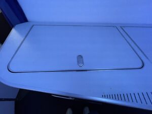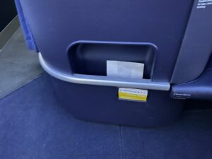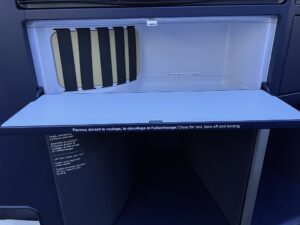 Ein erster kleiner Stauraum befindet sich vor den Kopfhörern, war jedoch von der Wasserflasche schon belegt. Unterhalb des Bildschirms befindet sich ein Fach, in dem kleine Gegenstände abgelegt werden könnten. Allem Anschein nach ist es auch dafür konzipiert, jedoch klebte ein kleiner No Stowage Aufkleber darin. Wahrscheinlich richtet sich dieser an die Crew.