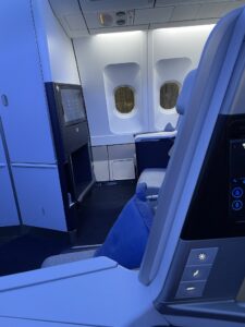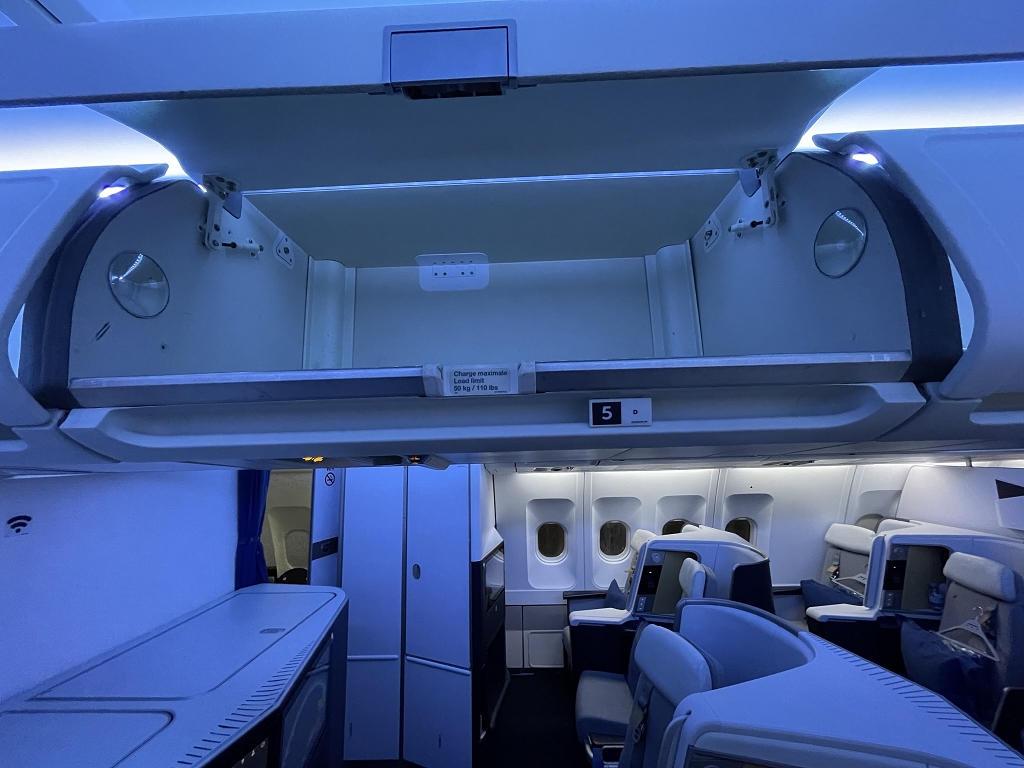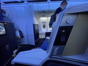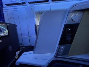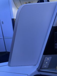 Durch das starke Spiegeln der Monitore verwandelt sich die Business Class in den Spiegelsaal von Schloss Versailles. Wenn man auf seinen Bildschirm guckt und dieser entweder ausgeschaltet ist oder ein dunkles Bild wiedergibt, sieht man – ohne es zu wollen – die Sitznachbarn. Bei mir waren es die Sitze A und C, auf die ich ungewollt gucken durfte. Mithilfe des Monitors zu meiner Rechten hatte ich sowohl meinen Nebenplatz als auch die Plätze K und L jederzeit im Blick. Und sie mich auch. Deshalb ist die ausfahrbare Trennwand zwischen den Sitzen eher dazu geeignet, direkten Sichtkontakt zu vermeiden, als die Privatsphäre tatsächlich zu erhöhen.