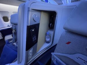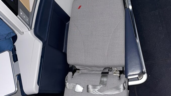 Der Business Class Sitz ähnelt stark dem Sitz bei Lufthansa, wobei Air France dem Sitz deutlich mehr „Drumherum“ spendiert, wodurch zum einen mehr Stauraum verfügbar wird, zum anderen die Privatsphäre ein wenig größer wird. Aber diese V-Stellung der Sitze mit dem grauen Sitzbezug, verleitet, Parallelen zu ziehen.