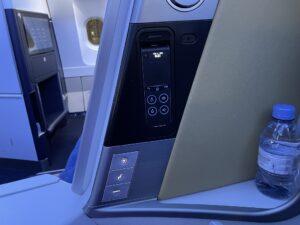 Das bringt mich zur zweiten Einschränkung bei dem Sitz: Man kann ihn nur hoch und runter regeln. Eine individuelle Einstellung der Rückenlehne oder der Fußstütze ist nicht möglich. Dadurch gibt Air France sämtliche möglichen Sitzwinkel vor. Andere Sitzwinkel für den Rücken kann man somit nur mit dem Kissen darstellen, was nicht immer optimal sein muss. Immerhin genügen dafür zwei Knöpfe und die Umstellung erfolgt motorisiert.