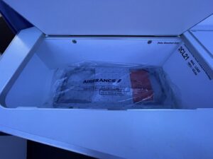 Der Fußraum ist leider stark beschränkt, da Air France sich entschieden hat, den Raum unterhalb des Fußfachs zu verblenden. Daher kann man die Füße (bzw. die Fußspitzen im Sitzen) nicht weit unter der Fußablage haben. Das hätte sicherlich ein paar Zentimeter mehr Platz gebracht, und den Sitzkomfort erhöht. Wenn man die Beine ausstrecken möchte, ist das nur möglich, wenn man diese hochnimmt und in das Fußfach legt.