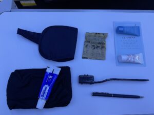 Das Amenity Kit wurde noch vor dem Start verteilt. Im Gegensatz zu den Amenity Kits in der Premium Economy Class enthält es in der Business Class Markenprodukte. Die Ohrstöpsel sind keine No-Name-Produkte mehr, sondern stammen von Uvex. Statt einer Minizahnpastatube erhält man hier eine Reisegröße von Signal. Auch die Augenblende und die Zahnbürste scheinen etwas hochwertiger. Außerdem erhält man noch jeweils eine Probentube Hand- und Gesichtscreme. Die Socken hingegen dürften in beiden Kits identisch sein.