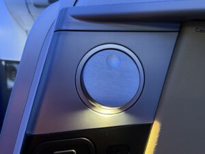 In der Armlehne zur Sitzmitte befindet sich eine Steckdose, die für sehr viele Stecker passend ist. Damit können auch größere Geräte während des Flugs betrieben bzw. aufgeladen werden. Ein USB-Anschluss befindet sich direkt darüber.