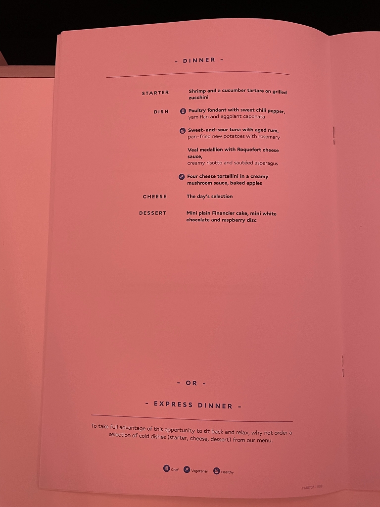 Zum Abendessen gab es eine Auswahl an Gerichten, die von den Flugbegleitern vorab abgefragt wurde. Ich entschied mich für den Thunfisch.