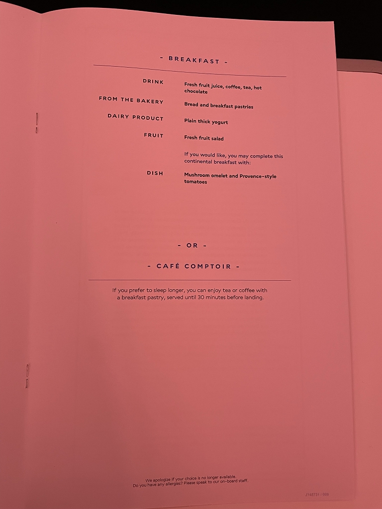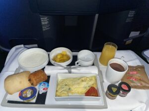 Das Frühstück wurde ca. eine Stunde vor der Landung serviert. Die Tabletts wurden in der Galley angerichtet und Passagiere durften sich entscheiden, ob sie die Omelette-Option wahrnehmen wollten, oder ob das kalte Frühstück ausreicht. Wer erst spät und dafür wenig frühstücken wollte, konnte sich auch für ein Croissant mit einem Heißgetränk entscheiden, was bis ca. 30 Minuten vor Landung angeboten wird.
