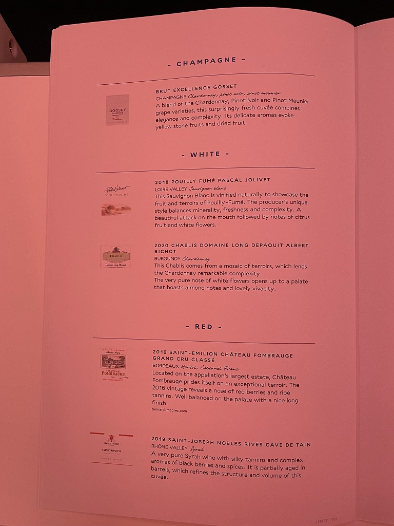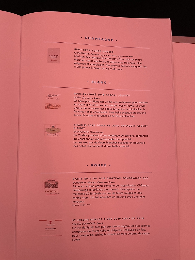 Die Getränkeauswahl war recht frankreichorientiert. Wasser, Weine und viele Spirituosen stammen von französischen Erzeugern. Beim Champagner handelte es sich um Brut Excellence Gosset. Ein Einsteigerchampagner dieses Hauses.