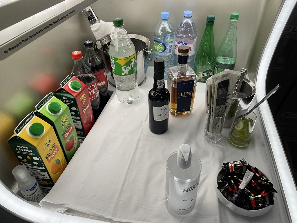 Die Tabletts wurden nach dem Essen jeweils zügig abgebaut. Für Service außerhalb der Servicezeiten habe ich mich immer auf den kurzen Weg in die Galley gemacht. Alles, was ich dort bestellte, wurde mir kurze Zeit später an den Platz gebracht.