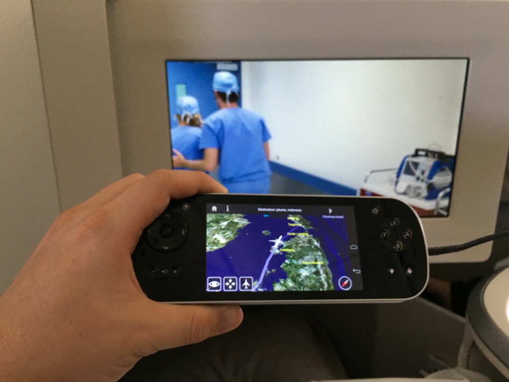 Der Monitor des Inflight Entertainment lässt sich über eine kleine Fernsteuerung mit Touchscreen bedienen. Was mir hierran besonders gut gefällt, ist dass man auf der Fernsteuerung auch andere Dinge, wie zum Beispiel die moving map anzeigen kann während man einen Film schaut.