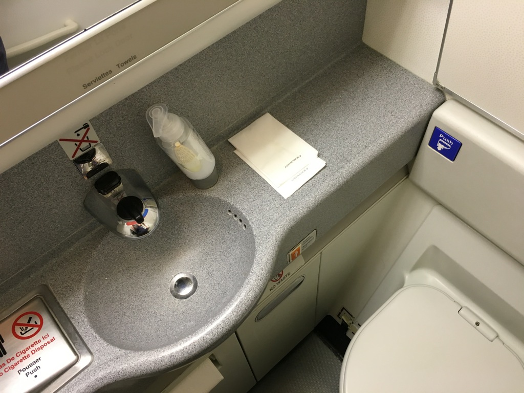Im Badezimmer standen einige Amenitys von Clarins. Allerdings waren diese bei weitem nicht so umfangreich, wie zum Beispiel bei Singapore Airlines, sodass man auf ein Amenity Kit komplett verzichten kann. Auf längeren Flügen bietet Air France übrigens ein Amenity Kit in der Business Class an. Auf diesem kurzen Flug nach Jakarta scheint man dieses allerdings eingespart zu haben. Als ich diesen Flug vor 2 Jahren geflogen bin, wurden noch Amenity Kits auf der Singapur- Jakarta Strecke verteilt.