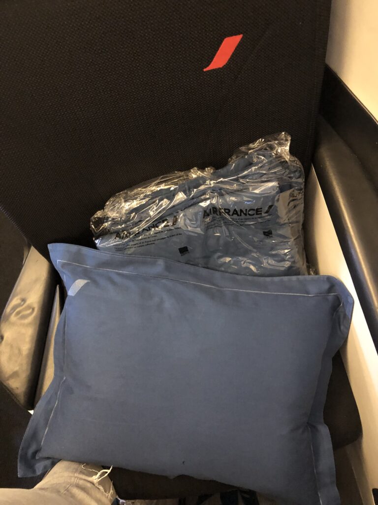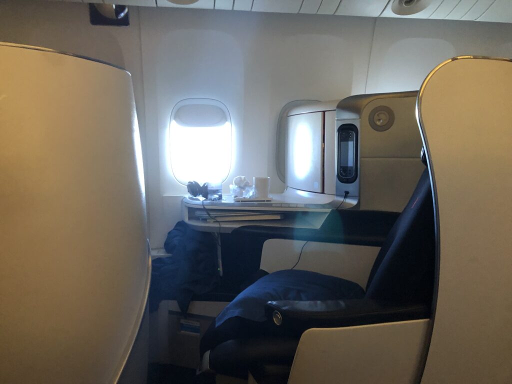 Decke, Kissen und Kleiderbügel lagen bereits auf dem Sitz, Amenity Kit und Speisekarten waren ebenfalls schon ausgesteckt.