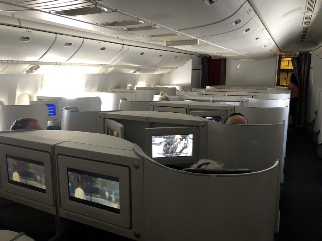 Der erste Eindruck war ganz gut, eine gewisse Abnutzung konnte man aber hier und da erkennen. Die B777-200 ist ohne First Class konfiguriert, die Business Class war in zwei Compartments aufgeteilt.