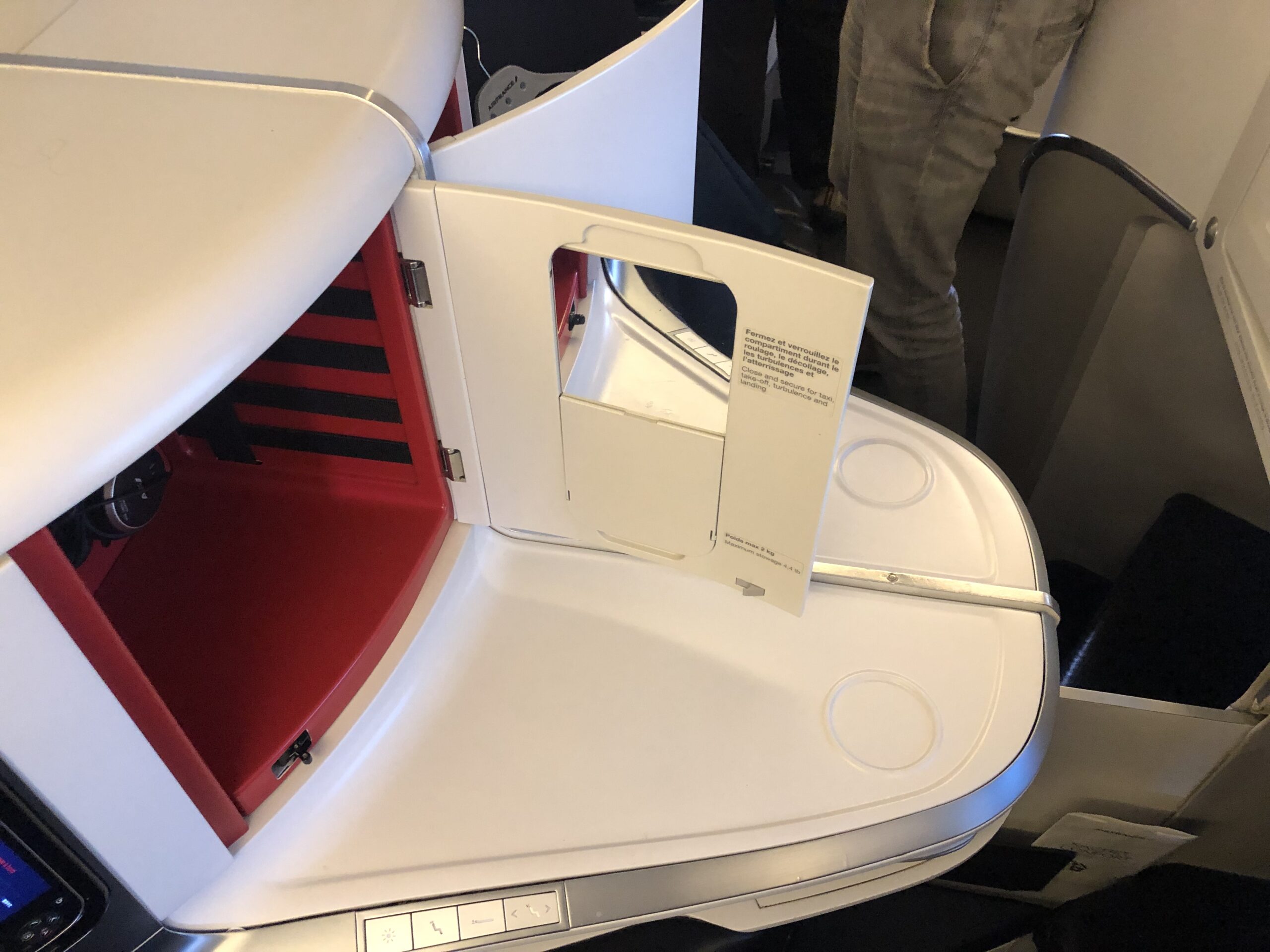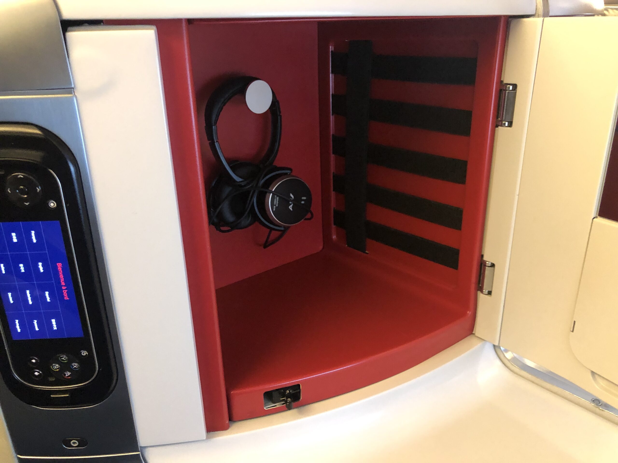 Ablageflächen befinden sich am oder über dem Sitz, in einem Fach zwischen den Sitzen waren die Kopfhörer. Dort war war auch ausreichend Platz um persönliche Gegenstände unterzubringen.