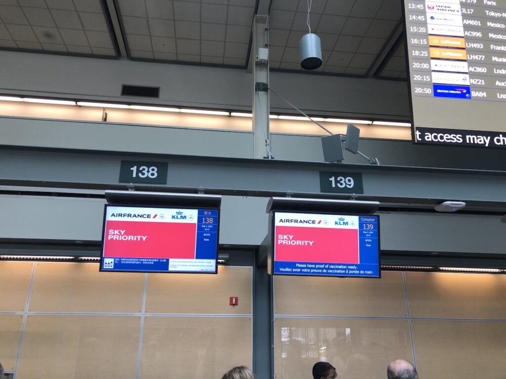Nach dem Aufenthalt in der Skyteam Lounge sind wir zum nahegelegenen Gate, dort parkte die 777 der französischen Airline. Der Aufruf zum Einsteigen ging etwas verspätet los, die wartenden Passagiere wurden allmählich ungeduldig. Hilfsbedürftige und Familien konnten dann zuerst in die Maschine, es folgten Gäste mit Sky Priority Aufdruck auf der Bordkarte.