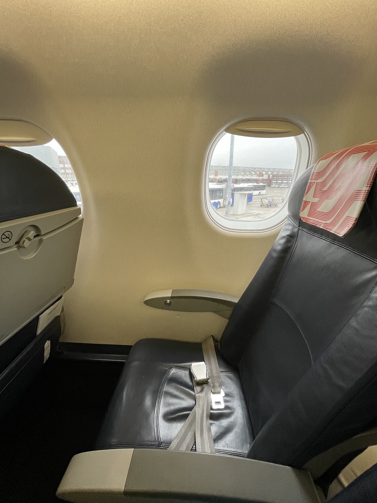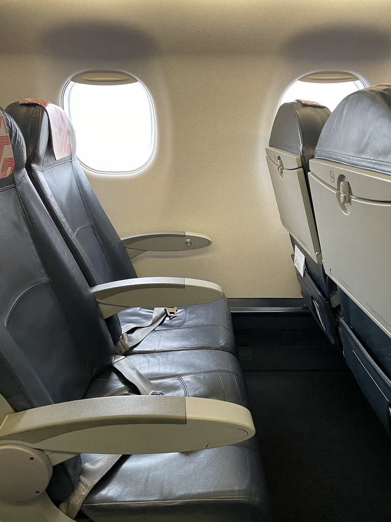 Die Rückenlehnen der Sitze sind ein wenig kurz, so dass große Menschen kaum Unterstützung an den Schultern erfahren. Zum Glück werden mit dem Flugzeug keine langen Strecken geflogen.