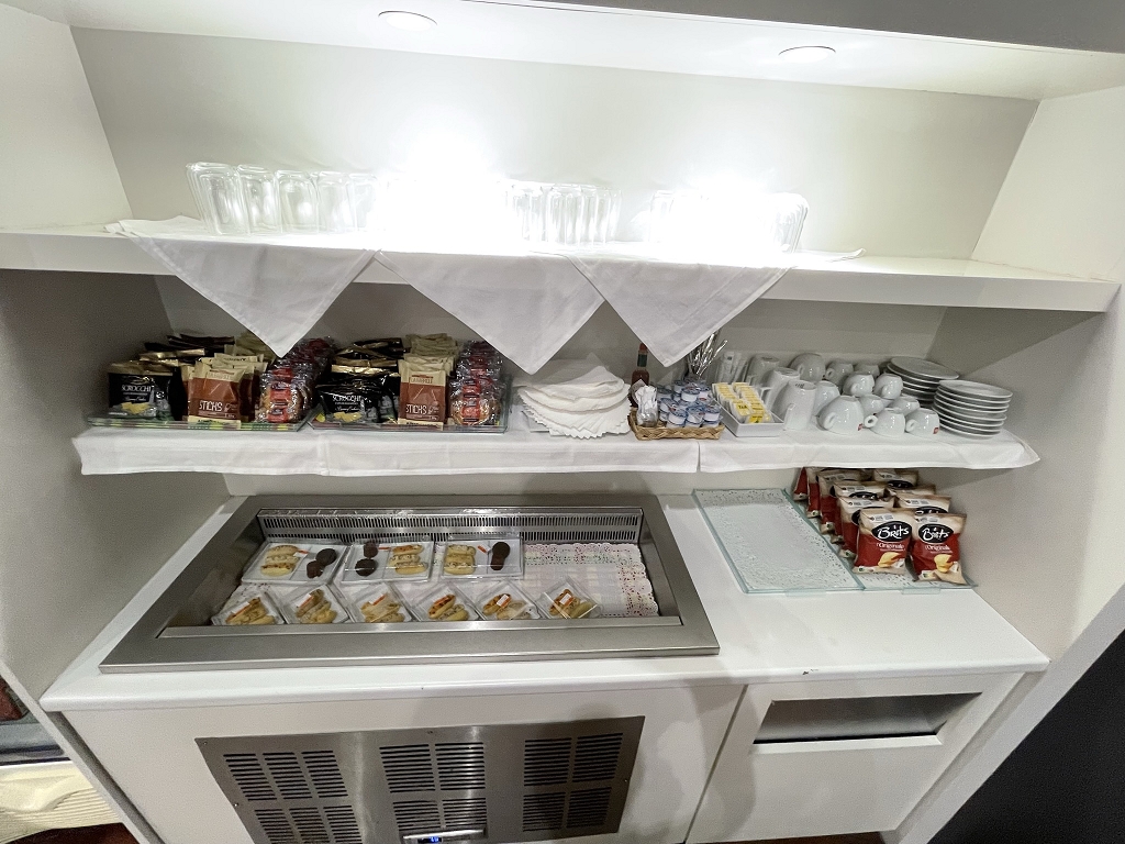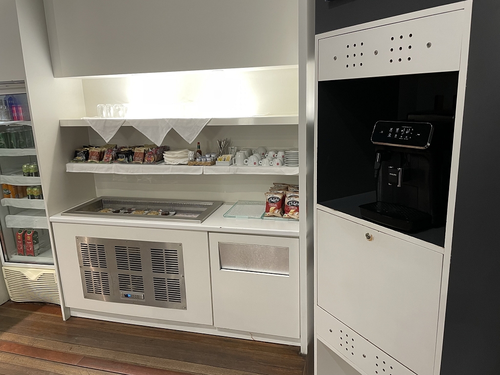 Direkt hinter der Tür ist der kleine Front Desk, an dem die Zugangskontrolle durchgeführt wird. Weiter geradeaus blickt man auf das Selbstbedienungsbuffet für Speisen und Getränke. Auf dem Weg dorthin passiert man einen Wasserspender.
