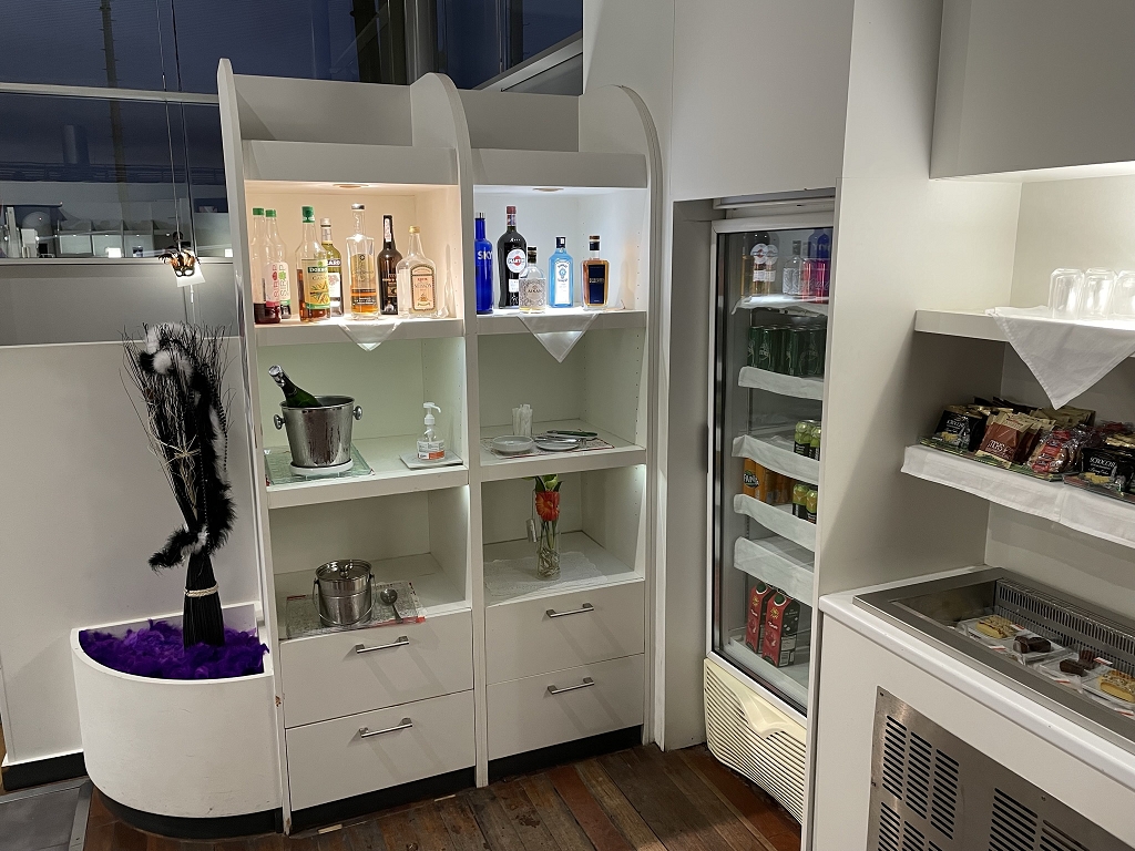 Daneben stehen in einem Regal Spirituosen und Sirups bereit. Die Auswahl ist allerdings etwas ungewöhnlich, denn es gibt z.B. französischen Whisky (Bellevoye) und Pastis (Anislikör). Beim Rum ist die Lounge ebenfalls lokal unterwegs und bietet Rhum Neisson aus Martinique und Le Cayennaise aus Französisch-Guayana an.
