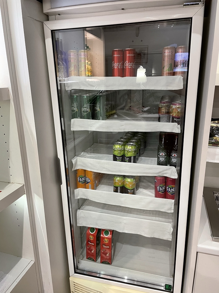 Bei den Getränken gibt es Softdrinks in Dosen und Weißwein aus einem Kühlschrank.