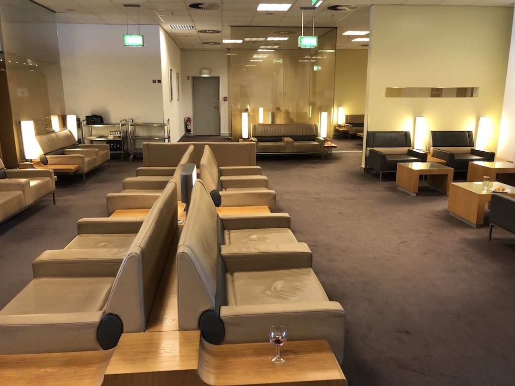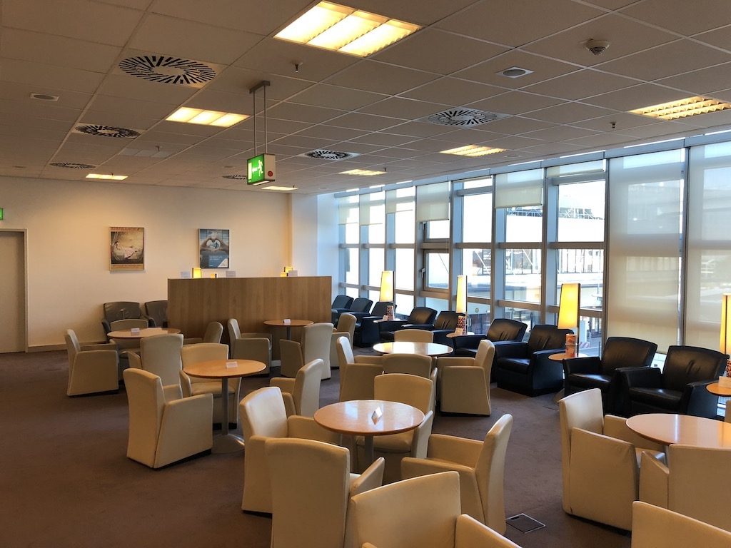 Ein kleiner Empfangsraum dient zur Überprüfung der Bordkarten. Gegenüber dem Empfangstresen findet sich eine Auswahl an mehrsprachigen Zeitungen und Zeitschriften. Die Lounge selbst ist in zwei große Bereiche gegliedert und insgesamt in angenehmen Creme-, Braun- und Schwarztönen gehalten. Zur Rechten befindet sich ein Loungebereich mit zahlreichen Sesseln und seitlichen Tischen, welcher zum Teil mit Glaswänden abgegrenzt ist und so ausreichend Platz zum Ausruhen und Arbeiten bietet.