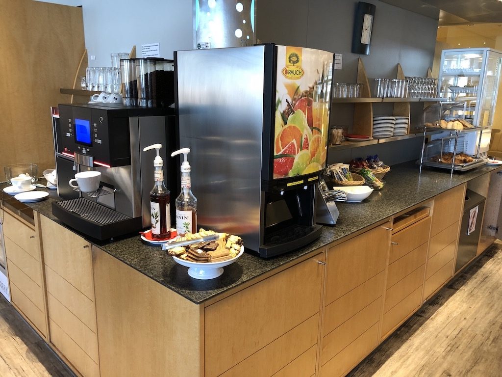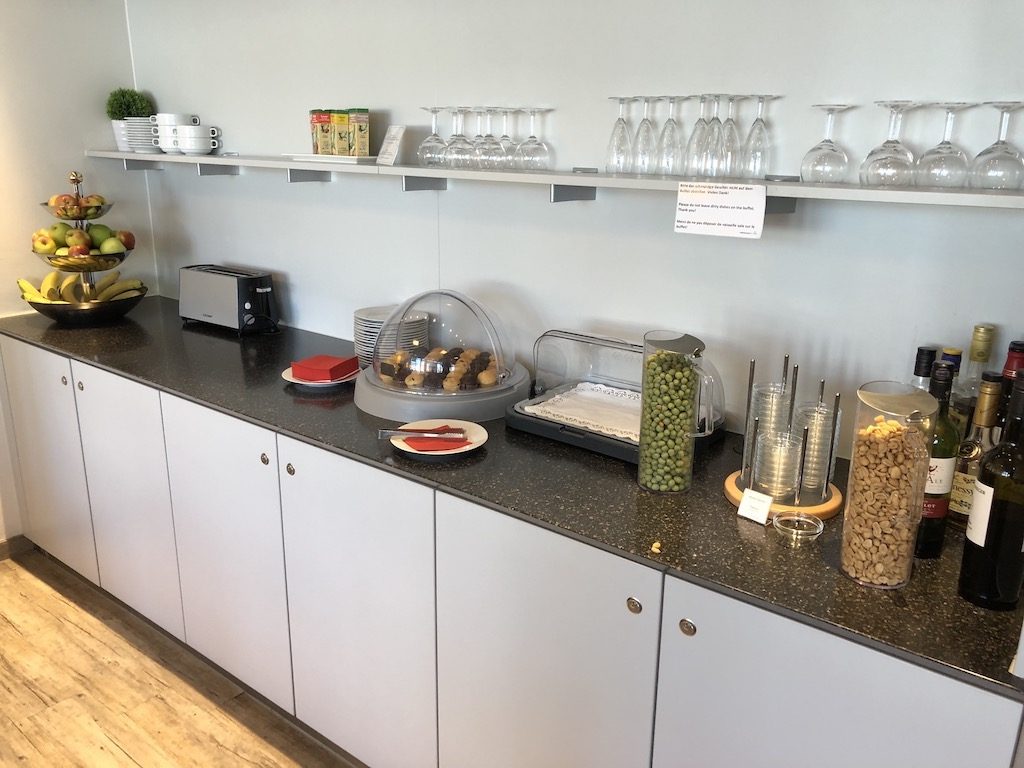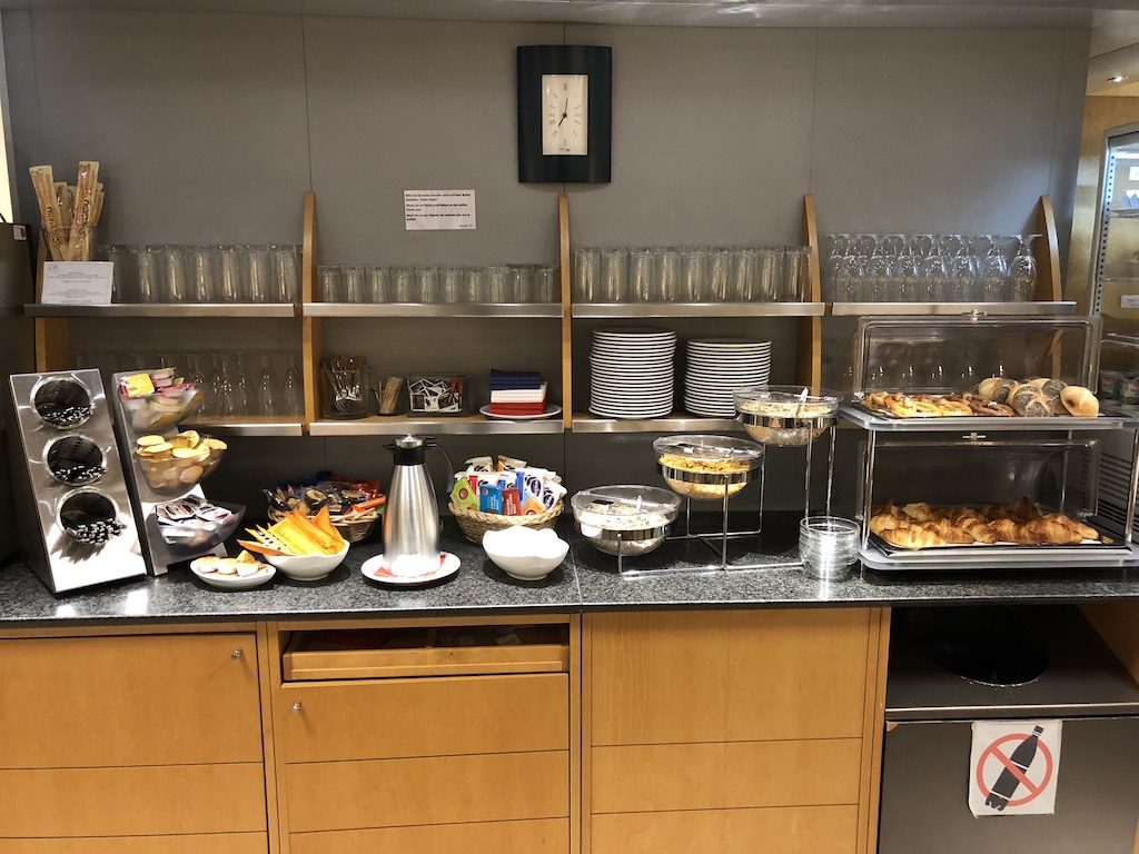 Zentral in der Lounge befindet sich in einer L-Form das Buffet, welches die übliche Auswahl an Softdrinks (Wasser, Coca-Cola regulär, light, zero, Schweppes Ginger Ale, Schweppes Tonic Water und Schweppes Bitter Lemon), Säften, Wein, Bier (Becks Pilsner, Paulaner Hefeweizen, Heineken Pilsner, Jever Fun alkoholfrei), Spirituosen (u.a. Gordons Gin, Jim Beam Bourbon, Henessy Weinbrand, Ballantines Scotch), und Kaffee- und Teespezialitäten bietet. Champagner wird nicht angeboten, jedoch ein ordentlicher Crémant von Bouvet. Ganztägig bietet die Lounge eine Auswahl an Obst, Schokoriegeln, Nüssen, Bifis und Keksen. Zusätzlich ist es möglich am Morgen ein Frühstück bestehend aus Brötchen, Laugenbrezeln, Croissants, sowie diversen Aufstrichen, Wurst und Käse einzunehmen. Cerealien, Jogurt, Obstsalat und weitere Frühstücksbasics standen ebenfalls zur Verfügung.