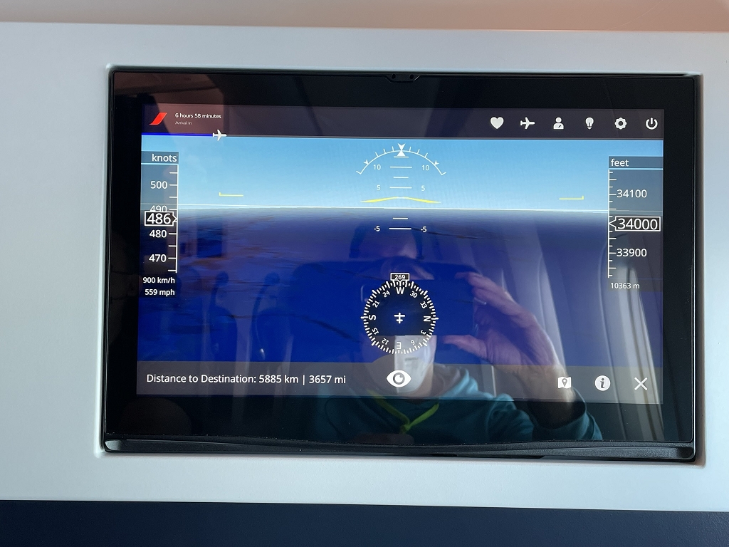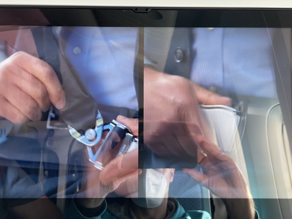 Bevor man jedoch das Entertainment System nach eigenem Geschmack nutzen darf, gibt es erst ein Sicherheitsvideo. Gesprochen wird abwechselnd auf Französisch und Englisch, wobei zweitere Sprache mit einem deutlichen französischen Akzent intoniert wird. Im Anschluss an das Sicherheitsvideo folgt noch ein Video zur korrekten Maskennutzung und -entsorgung. Während des Flugs gab es mehrere Ansagen, dass Masken wieder aufzusetzen seien.